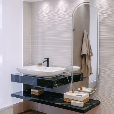 Espejo sin marco de 50×150 cm con sensor One Touch y luz LED integrada. Ideal para baños contemporáneos, ofrece una visión clara y una iluminación suave y uniforme.