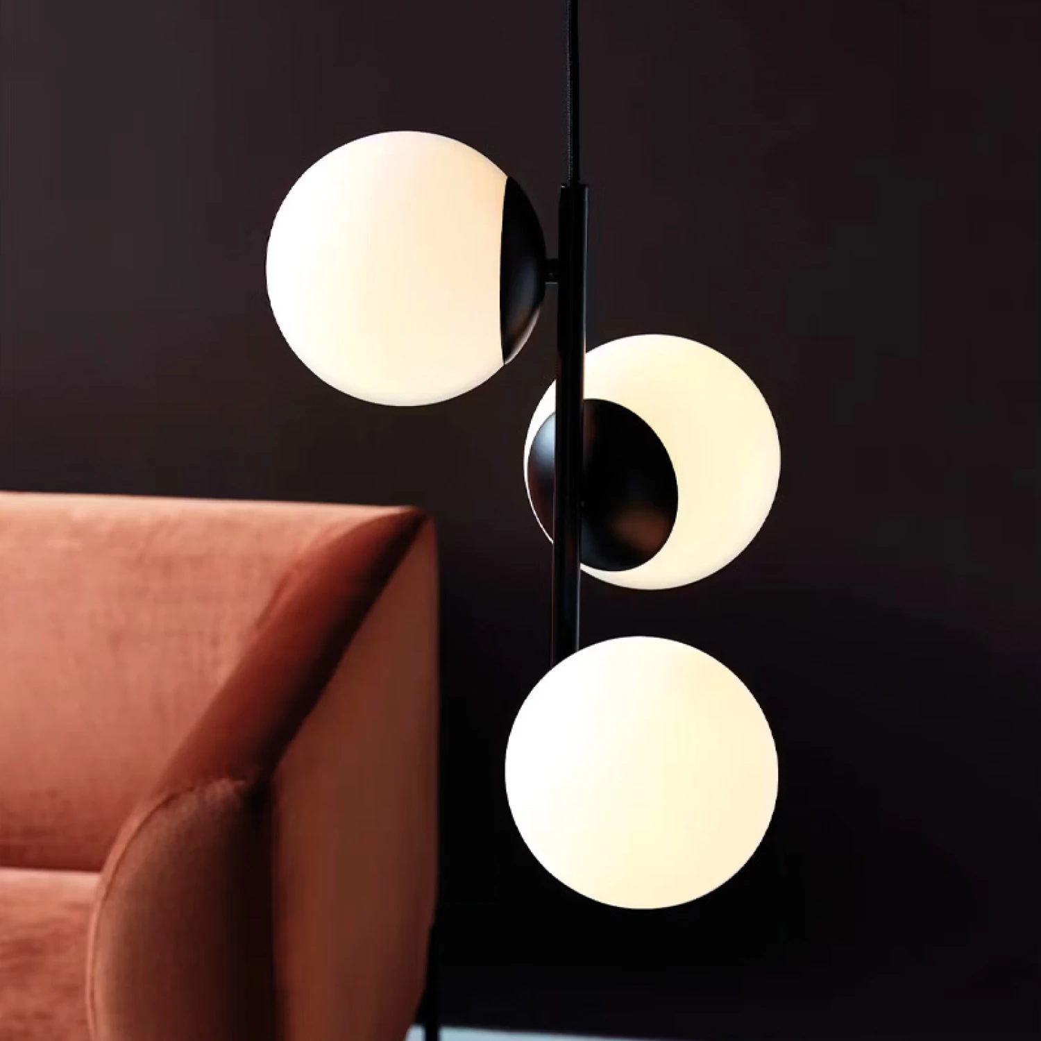 Esta luminaria fusiona a la perfección sencillez y elegancia. Su estructura minimalista se complementa con las sofisticadas cúpulas de cristal, que permiten que la luz se filtre a través del cristal blanco opalino. Este diseño no solo destaca por su elegancia, sino que también sigue una de las principales tendencias de diseño contemporáneo. La disposición de las cúpulas luminosas crea un efecto decorativo único, añadiendo un toque de distinción y estilo a cualquier espacio.
