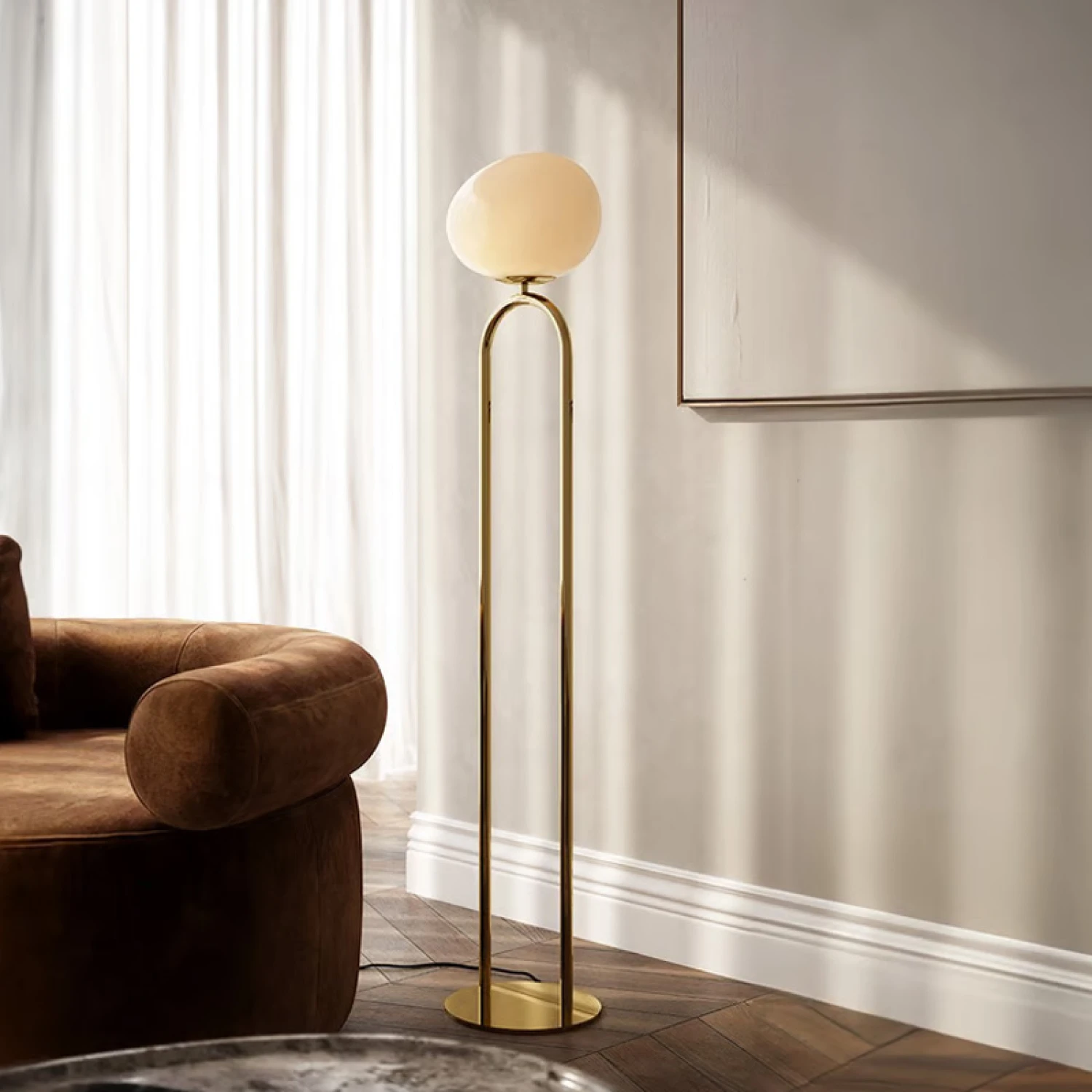 La Luminaria de Pie Bake presenta una elegante estructura de metal combinada con una pantalla de cristal de diseño asimétrico. Su diseño único y sofisticado es ideal para realzar cualquier espacio, dando un toque decorativo a tu hogar. Ofrece una suave y acogedora iluminación, creando el ambiente perfecto para trabajar o relajarse.